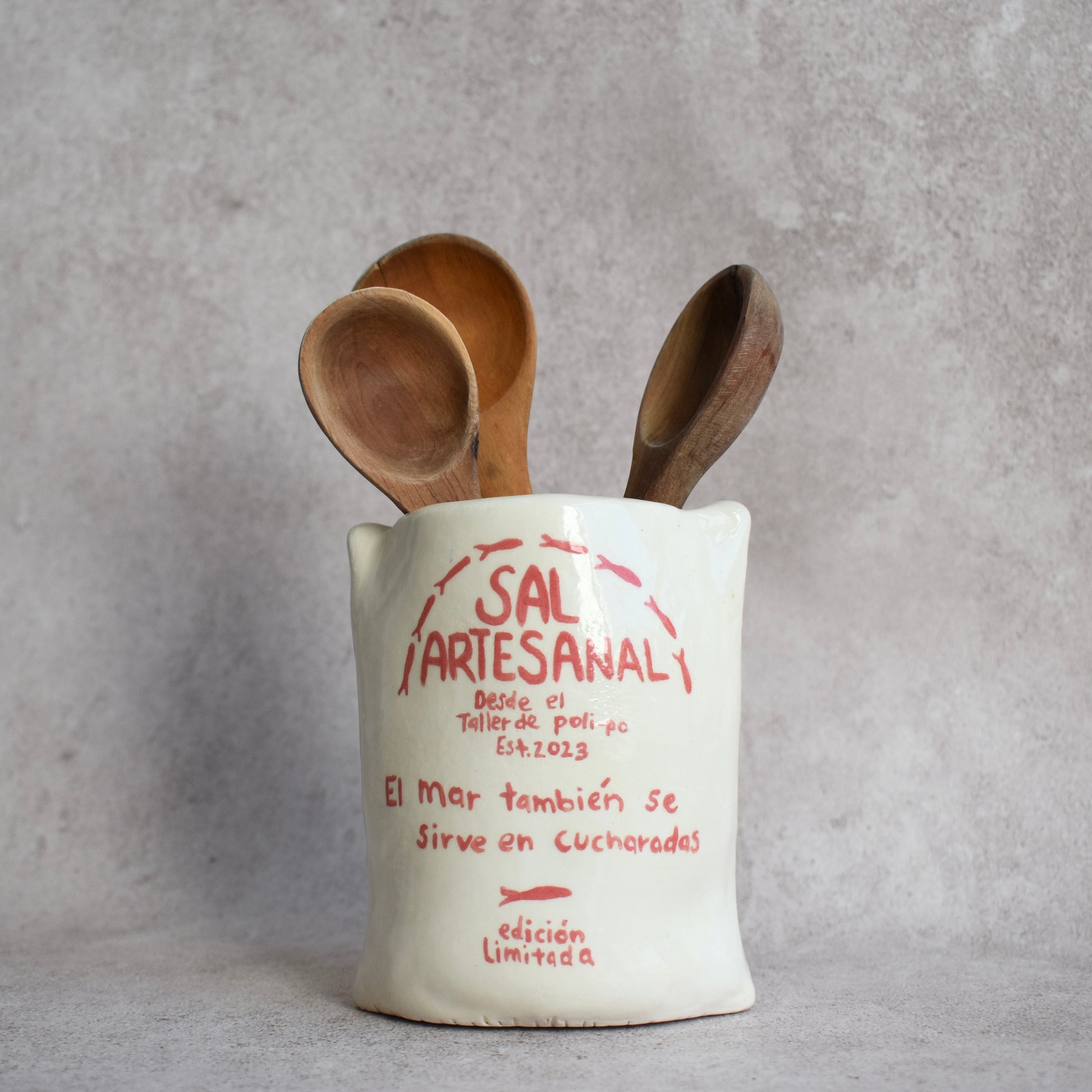 De la serie De objetos a floreros. Esta pieza salió de estar mirando las bolsitas de sal artesanal de Colima que siempre me han encantado. Puede usarse como florero o para poner utensilios en la cocina.