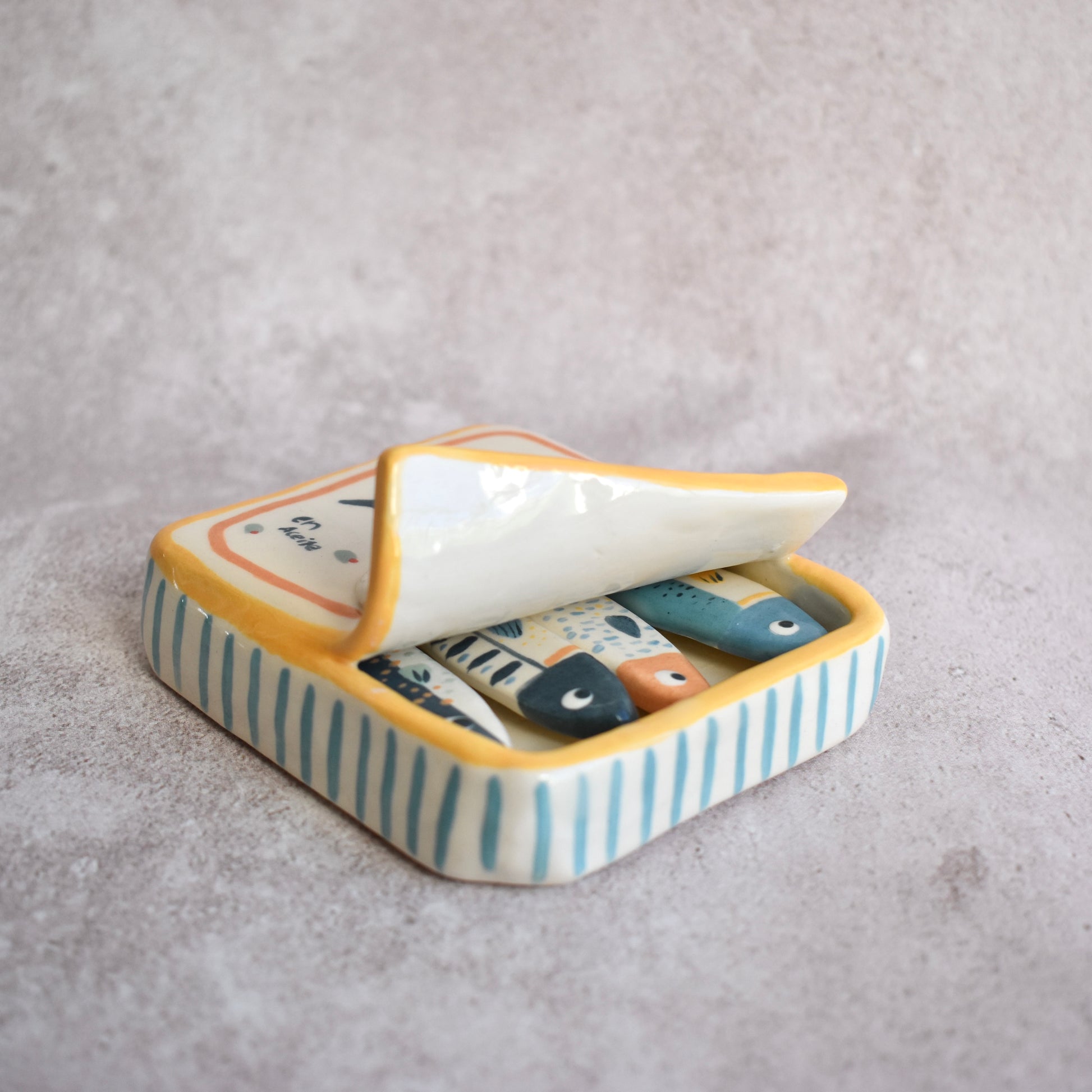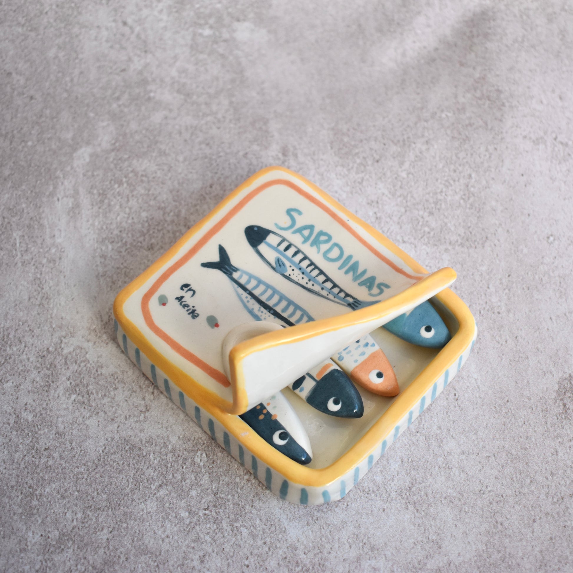 Una latita con 4 sardinas con imán, las sardinas son parte fundamental de nuestros océanos siendo alimento de infinidad de especies (incluyéndonos), inspirándome en las coloridas latas que encontramos en el mercado nace este diseño para decorar nuestros espacios y recordar estos peces tan pequeños, hermosos e importantes.