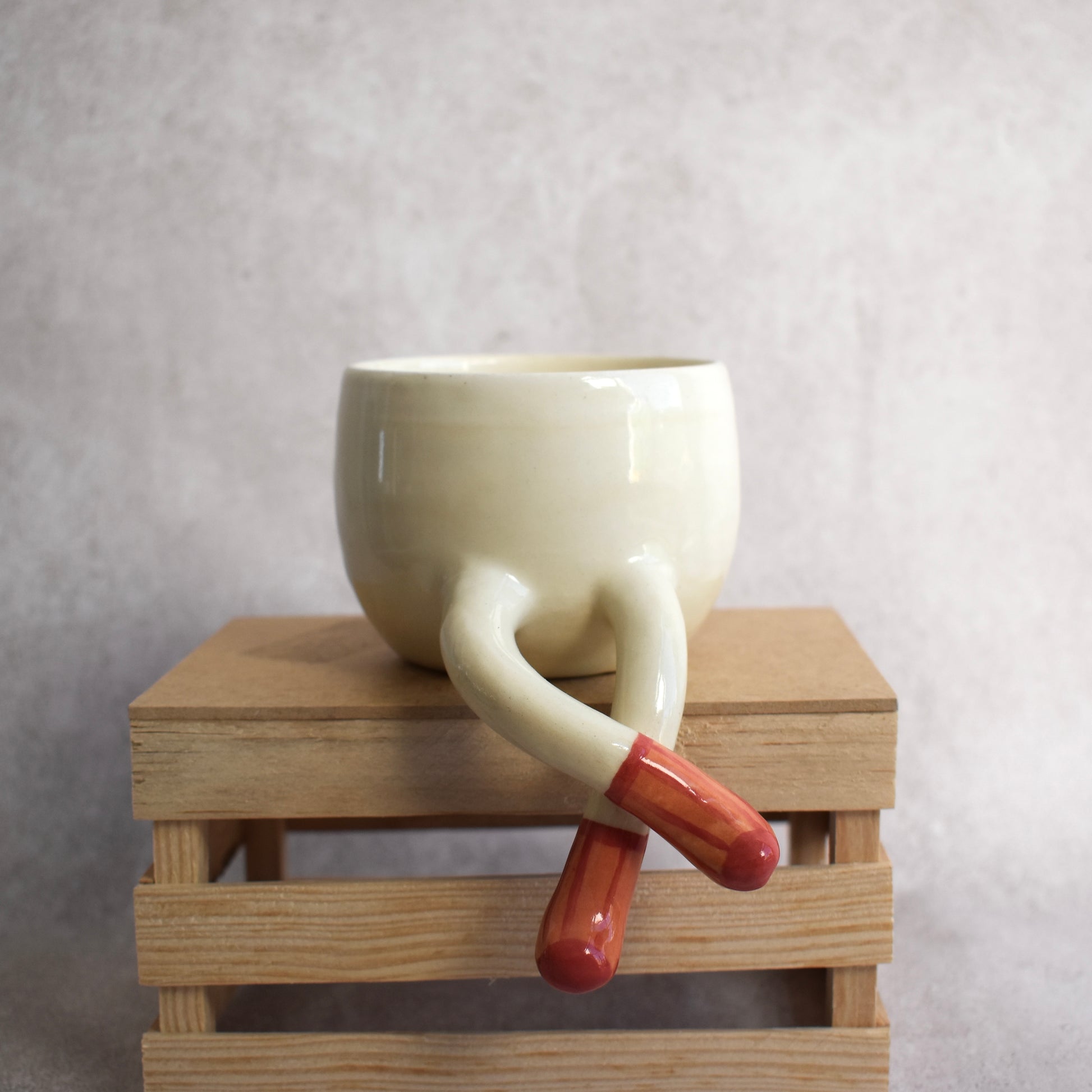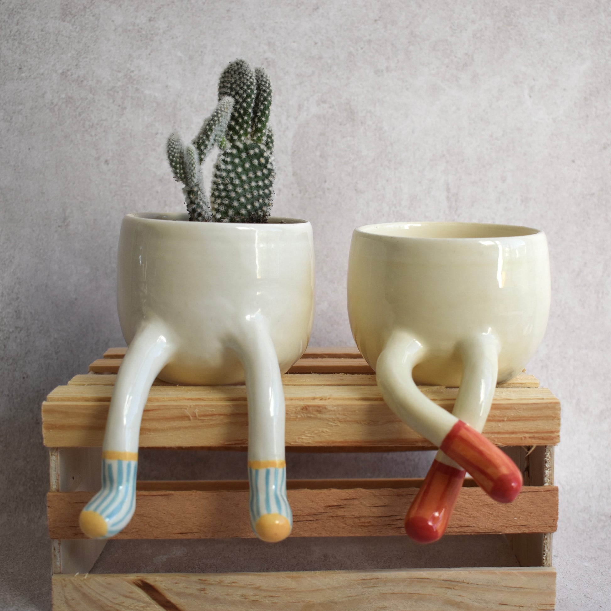 Una maceta que parece estar descansando, literalmente. Macetas hechas especialmente para repisas, alegrar y llenar de personalidad espacios. Hecha a mano en cerámica, con unas piernas colgantes y calcetines azules con amarillo. Ideal para que tus plantas tengan piernas propias.