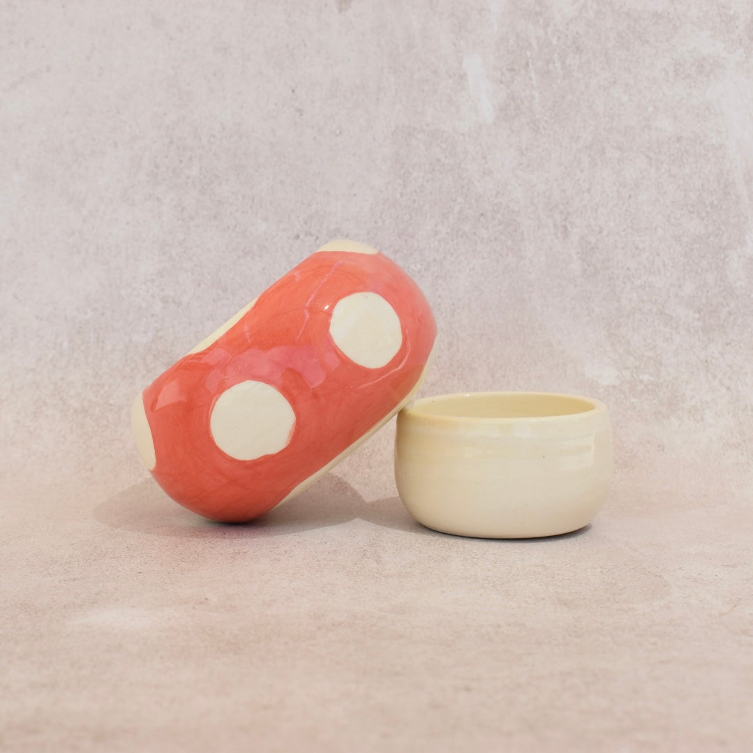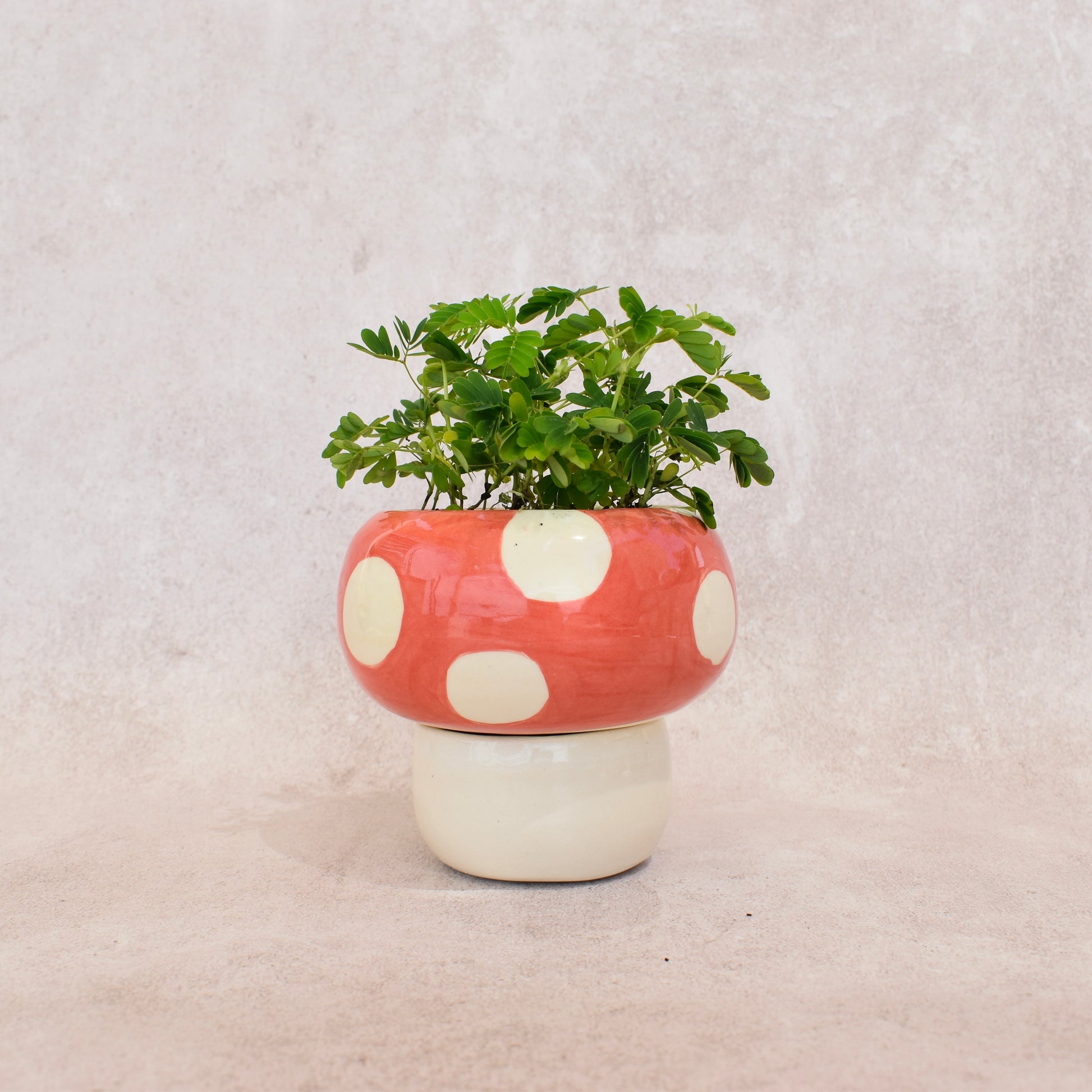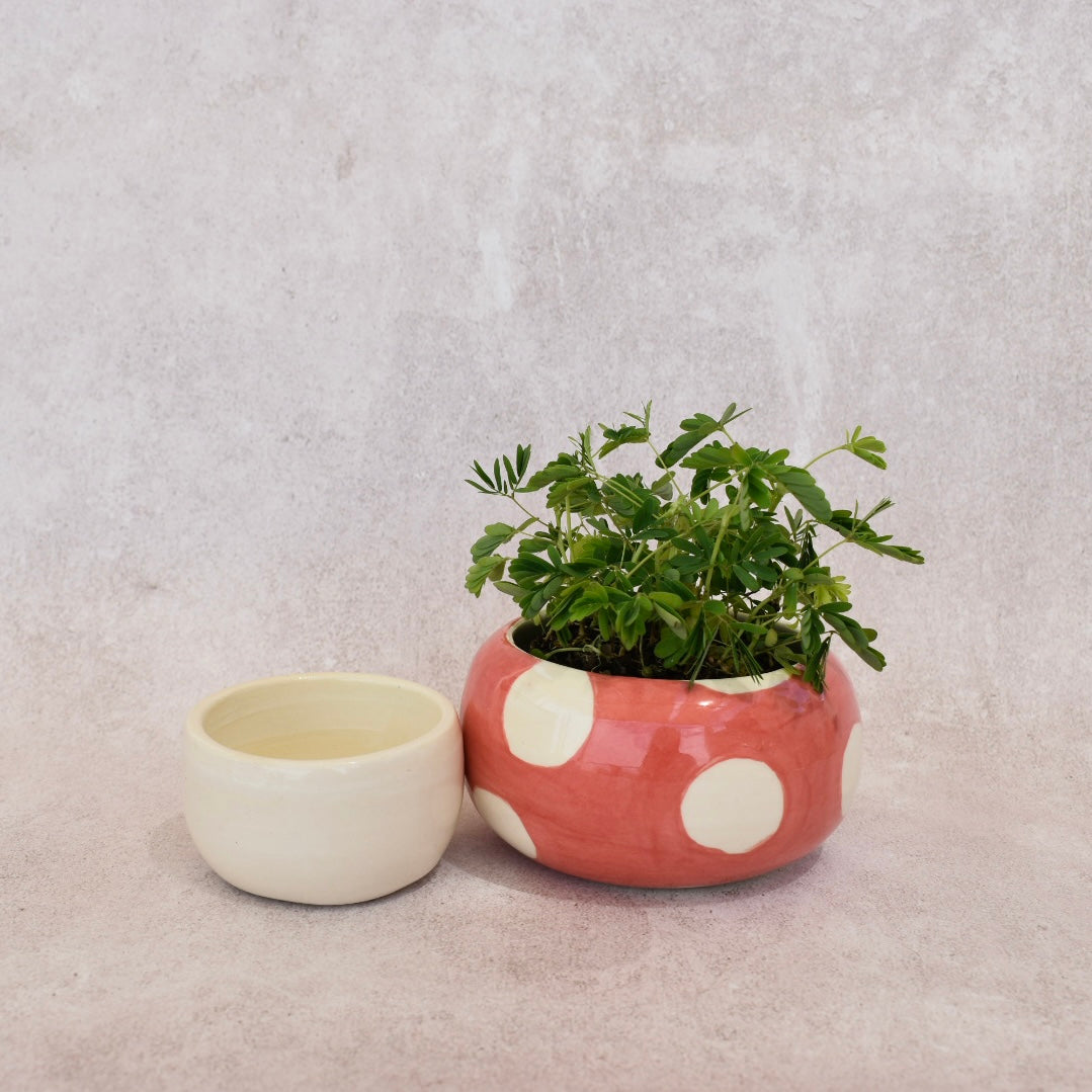 Esta maceta esta separada en dos partes: la cabeza del hongo y su pie. Al regar las plantitas escurre agua, por eso esta maceta de hongo tiene un cuenco para captar el agua y poder vaciarlo cada que sea necesario.