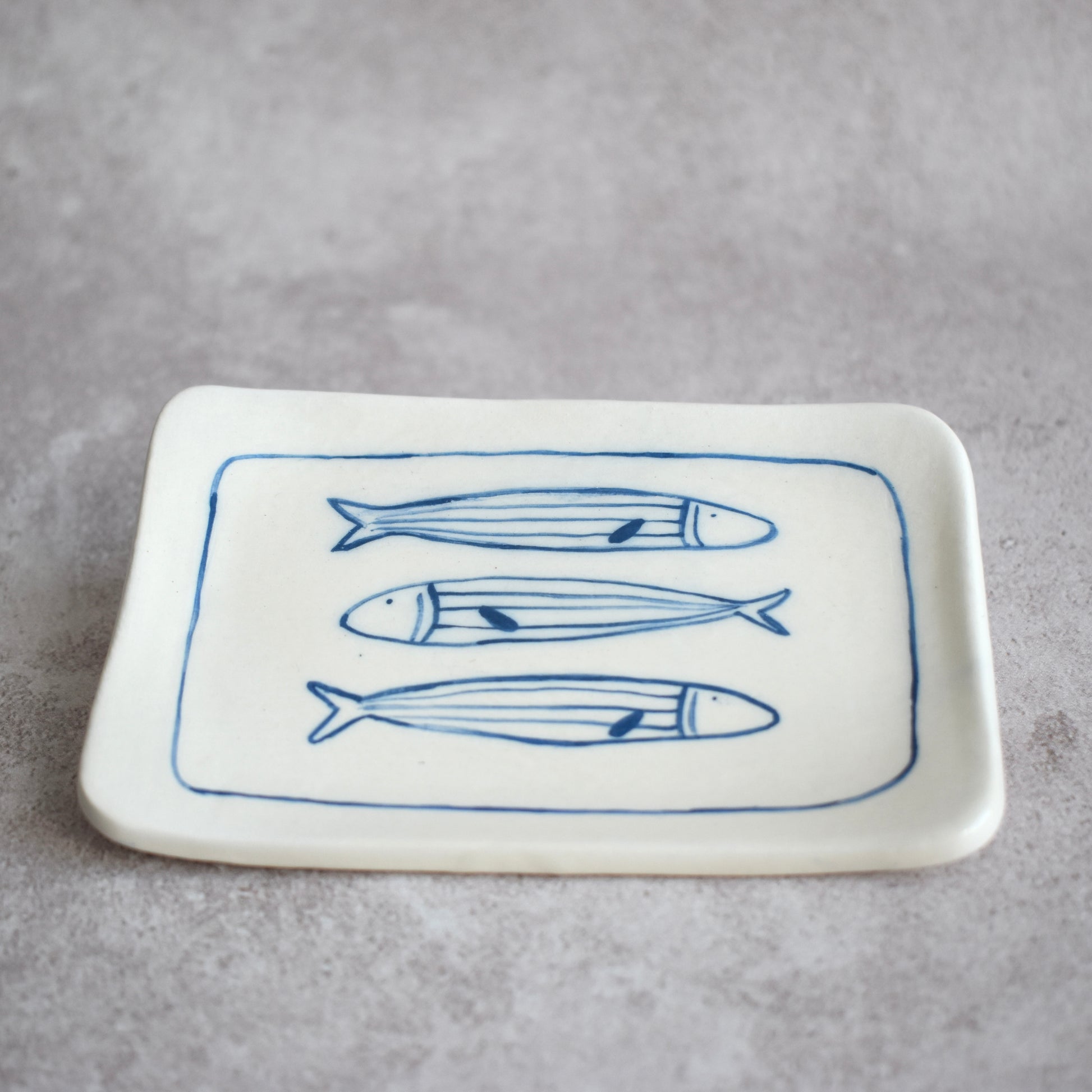 Pequeño platito rectangular con tres sardinas nadando en la superficie. Ideal para servir botanas, sostener joyería, decorar tu espacio o para lo que se te ocurra. Porque todo se ve mejor con un toque marino.