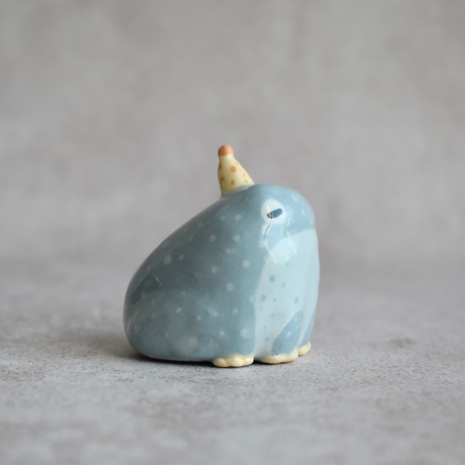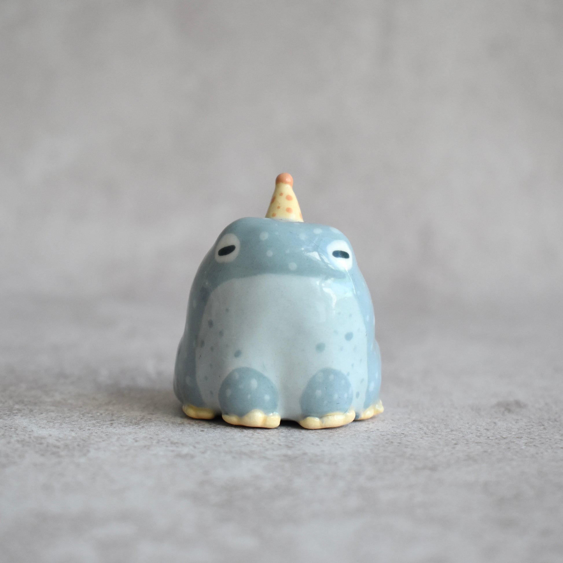 Ranita mini azul con gorrito de cumpleaños, perfecta para sostener y cuidar tus anillos mientras se ve tiernísima haciéndolo. Sentada sobre un lirio, también sirve para guardar el resto de tu joyería. Decora y aporta alegría y color.