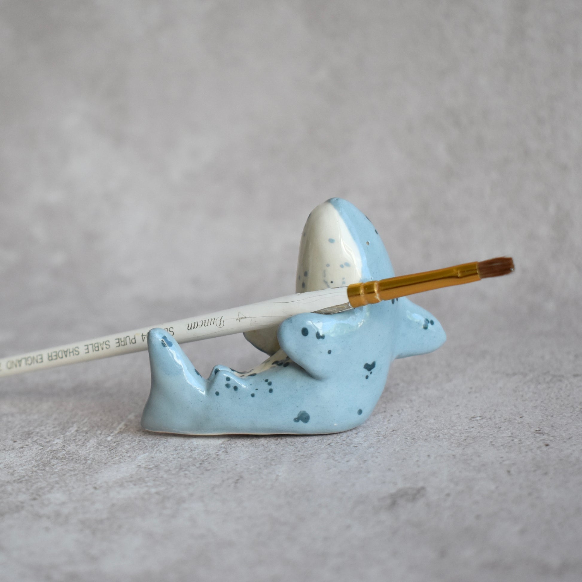 Este tiburón se sienta tranquilo, como si no tuviera prisa de nada. Le puedes confiar un pincel, una cuchara, un lápiz... o dejarlo solo, nomás decorando.